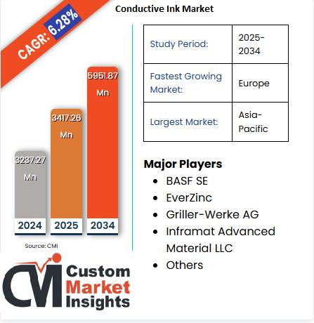 According to Custom Market Insights (CMI), The Global Conductive Ink Market size was estimated at USD 3237.27 Million in 2024 and is expected to reach USD 3417.26 Million 2025 and is expected to hit around USD 5951.87 Million by 2034, poised to grow at a compound annual growth rate (CAGR) of 6.28% from 2025 to 2034.➤ Request Free Sample PDF Report @ https://www.custommarketinsights.com/request-for-free-sample/?reportid=19024