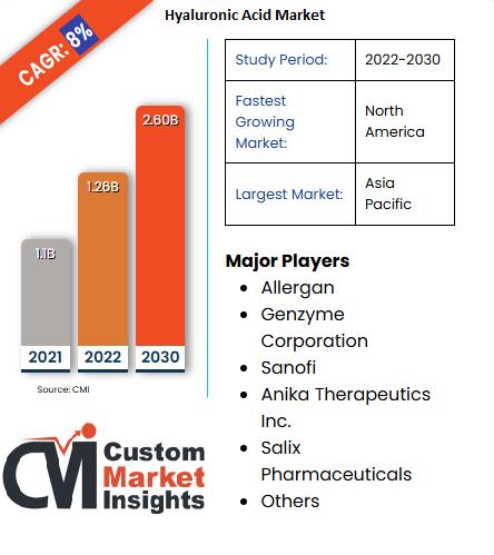 According to Custom Market Insights (CMI), The Global Hyaluronic Acid Market was estimated at USD 1.1 billion in 2021 and is expected to reach USD 1.26 billion in 2022 and is anticipated to reach around USD 2.60 billion by 2030, growing at a CAGR of roughly 8% between 2022 and 2030. Our research report offers a 360-degree view of the Hyaluronic Acid market's drivers and restraints, coupled with their impact…