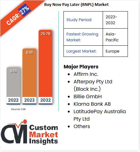 As per the current market research conducted by the CMI Team, the global Buy Now Pay Later Market is expected to record a CAGR of 27% from 2023 to 2032. In 2022, the market size is projected to reach a valuation of USD 6.1 Billion. By 2032, the valuation is anticipated to reach USD 25.7 Billion.