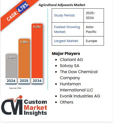 As per the current market research conducted by the CMI Team, the global Agricultural Adjuvants Marketis expected to record a CAGR of 4.78% from 2025 to 2034. In 2025, the market size is projected to reach a valuation of USD 4.3 Billion. By 2034, the valuation is anticipated to reach USD 6.2 Billion.