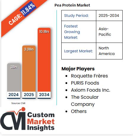 As per the Pea Protein Market analysis conducted by the CMI Team, the global Pea Protein Market is expected to record a CAGR of 11.84% from 2025 to 2034. In 2025, the market size is projected to reach a valuation of USD 3.3 Billion. By 2034, the valuation is anticipated to reach USD 10.1 Billion.