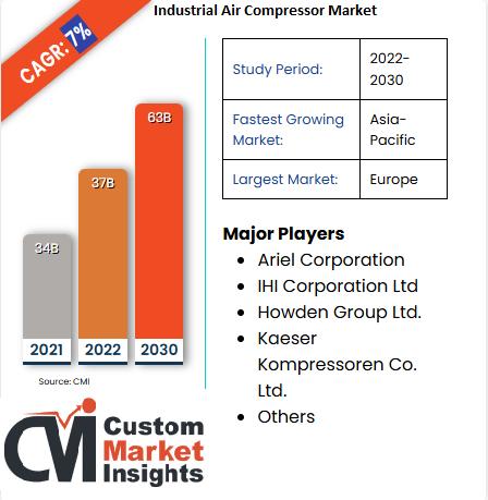 According to Custom Market Insights (CMI), The Global Industrial Air Compressor Market size was estimated at USD 34 Billion in 2021 and is expected to reach USD 37 billion in 2022 and is anticipated to reach around USD 63 Billion by 2030, growing at CAGR of roughly 7% between 2022 and 2030.➤ Request Free Sample PDF Report @ https://www.custommarketinsights.com/request-for-free-sample/?reportid=20241