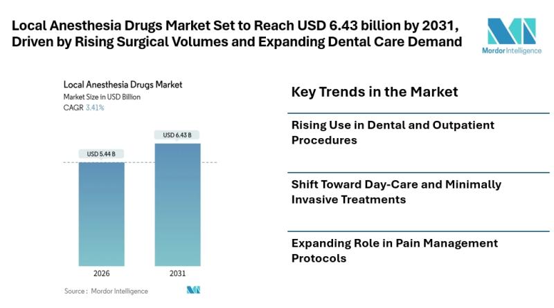 The Local Anesthesia Drugs Market [https://www.mordorintelligence.com/industry-reports/local-anesthesia-drugs-market?utm_source=abnewswire] size is estimated at USD 5.44 billion in 2026, and is expected to reach USD 6.43 billion by 2031, at a CAGR of 3.41% during the forecast period (2026-2031). This projection reflects steady demand across hospital, clinic, and outpatient settings, supported by…