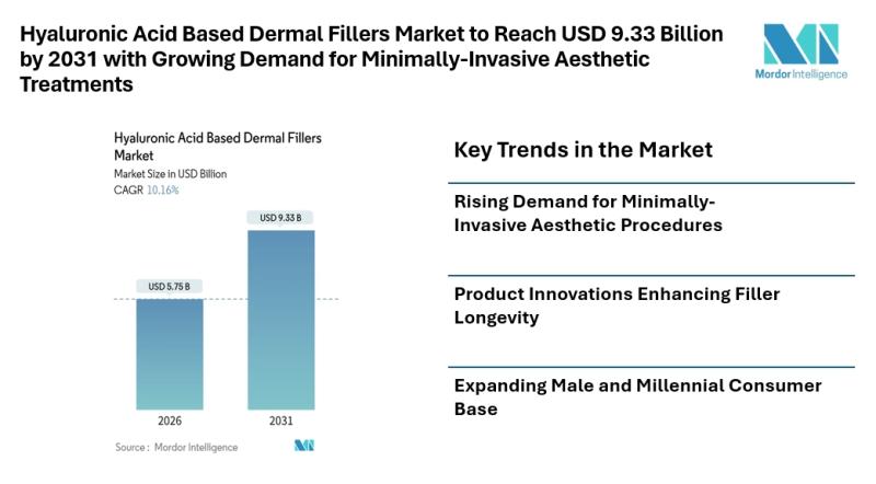 The Hyaluronic Acid Based Dermal Fillers Market [https://www.mordorintelligence.com/industry-reports/hyaluronic-acid-based-dermal-fillers-market?utm_source=abnewswire] size is estimated at USD 5.75 billion in 2026, and is expected to reach USD 9.33 billion by 2031, at a CAGR of 10.16% during the forecast period (2026-2031). The market's growth is driven by an increasing demand for minimally-invasive aesthetic procedures, a widening consumer base across different age groups, and innovations in product formulations that extend the longevity of fillers. North America currently leads the market, while Asia-Pacific is emerging as the fastest-growing region due to rising awareness, affordability, and increased adoption of aesthetic treatments.