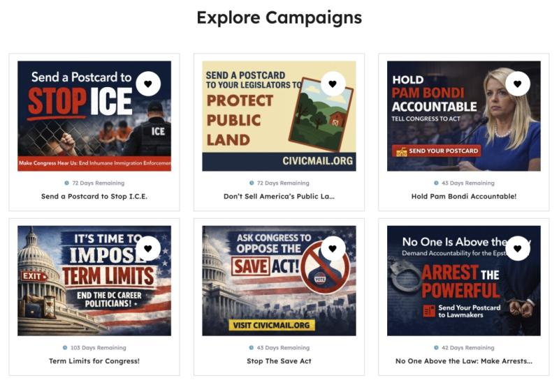 CivicMail.org [https://civicmail.org/] has announced its launch to help Americans send real, physical postcards to their elected officials with just a few clicks, delivering personalized messages directly to the desks of decision-makers at the local, state, and federal levels.