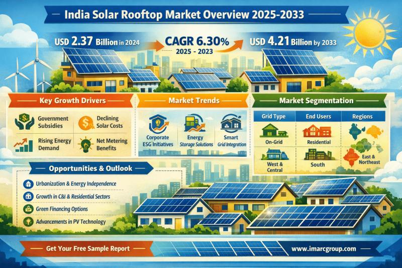 According to IMARC Group's report titled "India Solar Rooftop Market Size, Share, Trends and Forecast by Grid Type, End User, and Region, 2025-2033" the report offers a comprehensive analysis of the industry, including market share, growth, trends, and regional insights.
