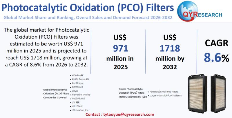 The global market for Photocatalytic Oxidation (PCO) Filters was estimated to be worth US$ 971 million in 2025 and is projected to reach US$ 1718 million, growing at a CAGR of 8.6% from 2026 to 2032.