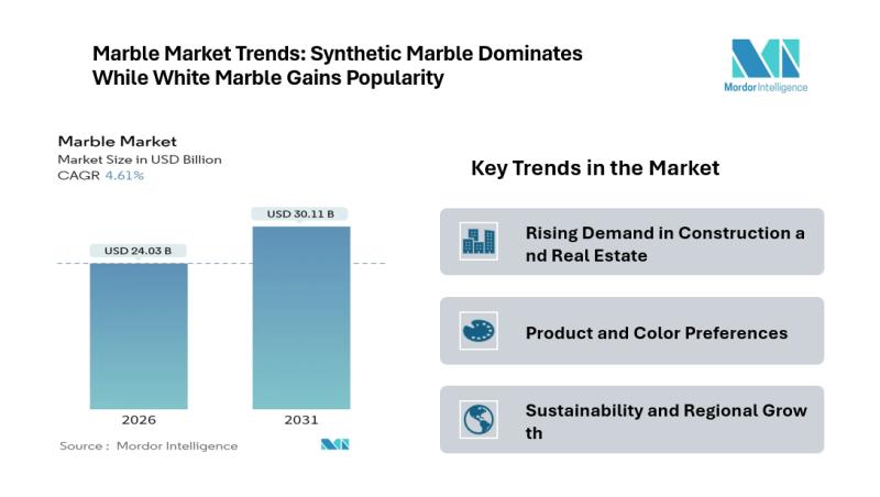 Global marble market size is valued at USD 24.03 billion in 2026 and expected to reach USD 30.11 billion by 2031 with a CAGR of 4.61%. Asia-Pacific leads both in size and growth, supported by infrastructure projects and residential demand. Synthetic marble dominates market share, while white marble remains the most preferred color.