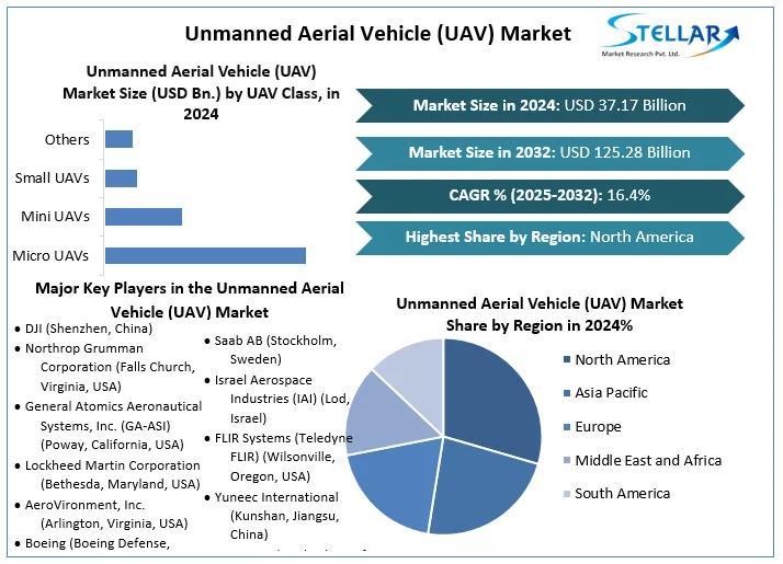 Unmanned Aerial Vehicle (UAV) Market size was valued at USD 37.17 Bn. in 2024 and is expected to reach USD 125.28 Bn. by 2032, at a CAGR of 16.4%.