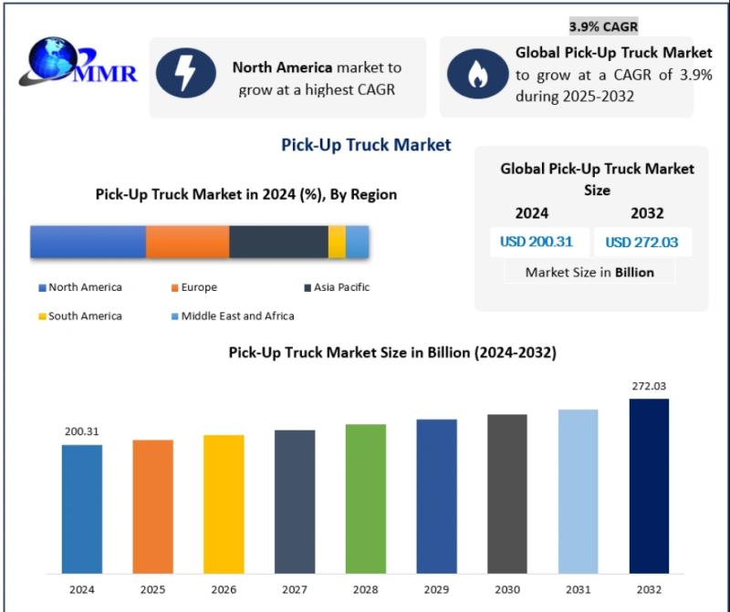 The Global Pick-Up Truck Market was valued at USD 200.31 Billion in 2024 and is projected to reach USD 272.03 Billion by 2032, expanding at a CAGR of 3.9% during the forecast period from 2025 to 2032. Market growth is driven by rising demand for light-duty utility vehicles, fleet expansion, and increasing adoption of hybrid and electric pick-up trucks worldwide.Market Overview