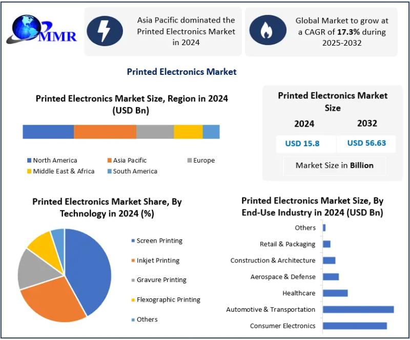 The Global Printed Electronics Market, valued at USD 15.8 Billion in 2024, is projected to expand rapidly, reaching approximately USD 56.63 Billion by 2032, growing at a robust CAGR of 17.3% during 2025-2032, according to a recent in-depth industry analysis by Maximize Market Research.Printed Electronics Market Overview: