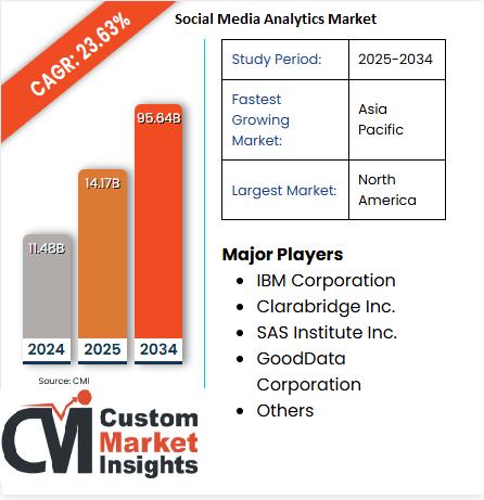 As per the research on the "Global Social Media Analytics Market", the market is estimated at around USD 14.17 Billion in 2025 and is projected to witness USD 95.64 Billion by 2034 at a CAGR growth of approximately 23.63% during 2025-2034.