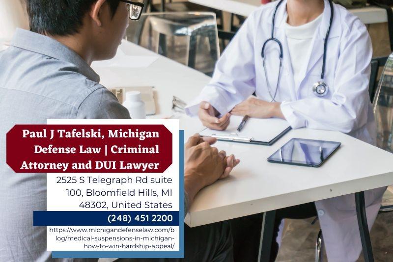Michigan drivers who lose their licenses due to medical conditions often find themselves facing a confusing and rigid system. Oakland County license restoration lawyer Paul J. Tafelski of Michigan Defense Law (https://www.michigandefenselaw.com/blog/medical-suspensions-in-michigan-how-to-win-hardship-appeal/) discusses how medical suspensions work in Michigan, and how drivers can pursue a Hardship Appeal to regain limited driving privileges.