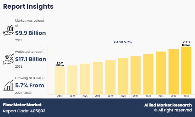 According to a new report published by Allied Market Research, the flow meter market size was valued at $9.9 billion in 2023 and is projected to reach $17.1 billion by 2033, growing at a CAGR of 5.7% from 2024 to 2033. The steady growth reflects rising demand for accurate flow measurement across energy, water, chemicals, and industrial processing sectors worldwide.