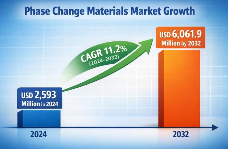The Phase Change Materials (PCM) market is witnessing rapid expansion as global industries intensify their focus on energy efficiency, thermal management, and sustainable building solutions. Valued at USD 2,593 million in 2024, the market is projected to reach USD 6,061.9 million by 2032, registering a robust compound annual growth rate (CAGR) of 11.2% from 2024 to 2032. This growth trajectory…