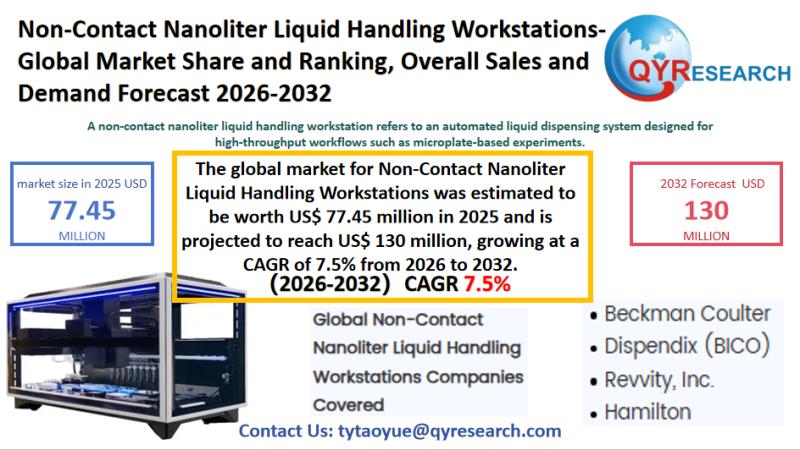 The global market for Non-Contact Nanoliter Liquid Handling Workstations was estimated to be worth US$ 77.45 million in 2025 and is projected to reach US$ 130 million, growing at a CAGR of 7.5% from 2026 to 2032.Global Leading Market Research Publisher QYResearch announces the release of its latest report "Non-Contact Nanoliter Liquid Handling Workstations - Global Market Share and Ranking, Overall Sales and Demand Forecast 2025-2031". Based on current situation and impact historical analysis (2020-2024) and forecast calculations (2025-2031), this report provides a comprehensive analysis of the global Non-Contact Nanoliter Liquid Handling Workstations market, including market size, share, demand, industry development status, and forecasts for the next few years.