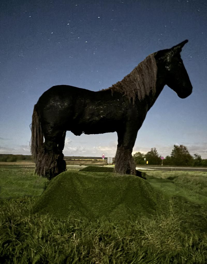 Since its creation, the sculpture has taken on a life beyond the studio. Appearing unexpectedly at night on major roundabouts around Norfolk, it has become an unofficial landmark. Its silent presence has delighted children, intrigued motorists and earned the quiet approval of local authorities, including police. These nocturnal appearances reinforced the sculpture's untamed character, reflecting both the roaming spirit of the horse and Norfolk's long-standing relationship with rebellion, independence and open land.