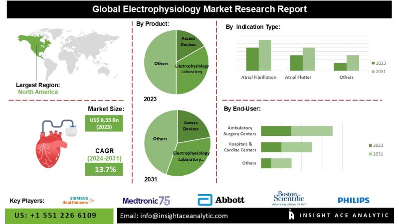 InsightAce Analytic Pvt. Ltd. announces the release of a market assessment report on the " Global Electrophysiology Market - (By Product (Electrophysiology Laboratory Devices, Electrophysiology Ablation Catheters, Electrophysiology Diagnostic Catheters, Access Devices, Others), By Indication Type (Atrial Fibrillation, Atrial Flutter, Atrioventricular Nodal Reentry Tachycardia (AVNRT), Wolff-Parkinson-White Syndrome (WPW), Others), By End-User (Hospitals & Cardiac Centers, Ambulatory Surgery Centers)), Trends, Industry Competition Analysis, Revenue and Forecast To 2031."