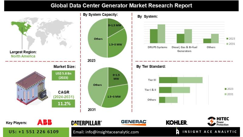 InsightAce Analytic Pvt. Ltd. announces the release of a market assessment report on the "Global Data Center Generator Market- (By System Capacity (0-1.5 MW, 1.5-3 MW, and >=3 MW) By System (DRUPS Systems, Diesel, Gas & Bi-fuel Generators, HVO Fuel, and Fuel Cells) By Tier Standard, By Region, Trends, Industry Competition Analysis, Revenue and Forecast To 2031."