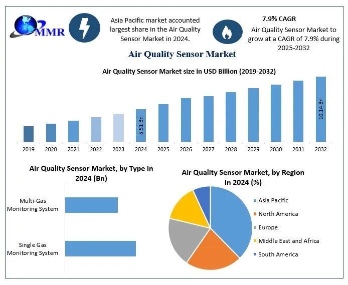 Air Quality Sensor Market size was valued at USD 5.51 Billion in 2024 and the total Air Quality Sensor revenue is expected to grow at a CAGR of 7.9% from 2025 to 2032, reaching nearly USD 10.14 Billion.