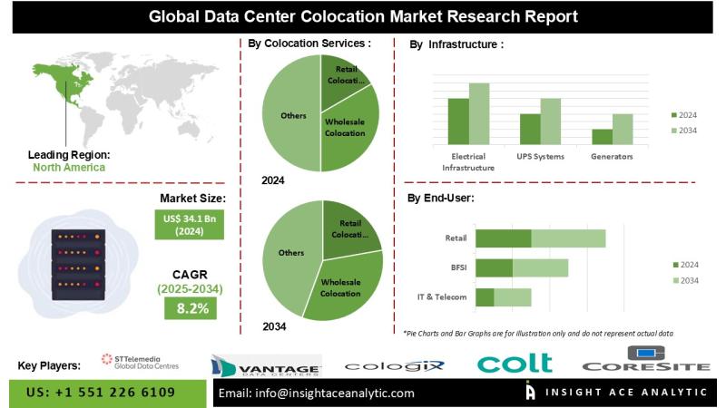 InsightAce Analytic Pvt. Ltd. announces the release of a market assessment report on the "Global Data Center Colocation Market- (By Colocation Service (Retail Colocation and Wholesale Colocation), By Infrastructure (Electrical Infrastructure, Mechanical Infrastructure, and General Construction), By Cooling Techniques (Air-based Cooling and Liquid-based Cooling) By End-user (Retail, BFSI, IT & Telecom, Healthcare, Media & Entertainment and Others) Trends, Industry Competition Analysis, Revenue and Forecast To 2034."