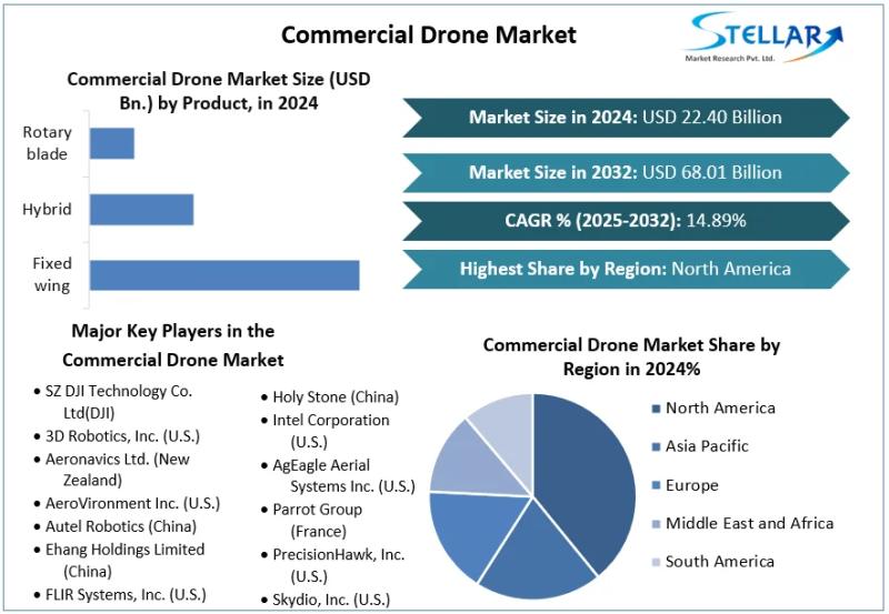 Beyond Aerial Photography How Commercial Drones Are Reshaping Modern Industries The Commercial Drone Market size was valued at USD 22.40 Billion in 2024. The market is expected to grow at a CAGR of 14.89 % during the forecast period from 2025-2032, reaching nearly USD 68.01 Billion by 2032. Introduction The commercial drone market has evolved rapidly from a niche technology used mainly for aerial photography into a transformative tool across multiple industries. Advances