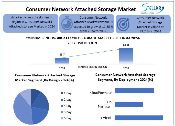 Consumer Network Attached Storage Market size was valued at USD 33.7 Bn in 2024 and the total revenue is expected to grow at a CAGR of 11.85% from 2025 to 2032, reaching nearly USD 82.55 Billion by 2032 The consumer network attached storage market is gaining increasing relevance as individuals and households generate and manage growing volumes of digital content. Photos, videos, documents, and media libraries are expanding rapidly due to