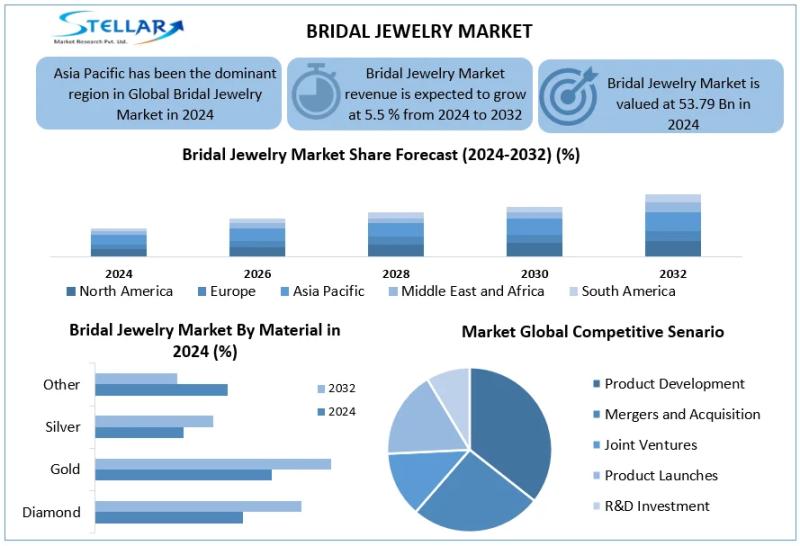 Bridal Jewelry Market was valued at USD 53.79 billion in 2024 and is projected to grow at a CAGR of 5.5% from 2025 to 2032 The bridal jewelry market holds a unique position within the global jewelry industry, blending cultural traditions, emotional value, and fine craftsmanship. Bridal jewelry symbolizes love, commitment, and social status, making it an essential part of wedding ceremonies across cultures. Rings, necklaces, earrings, bangles, and other ornaments