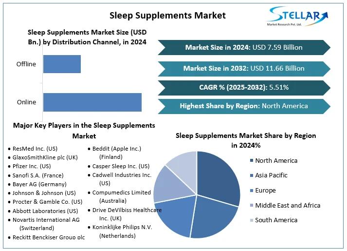 Sleep Supplements Market size was valued at USD 7.59 Bn. in 2024 and is expected to reach USD 11.66 Bn. by 2032, at a CAGR of 5.51%.