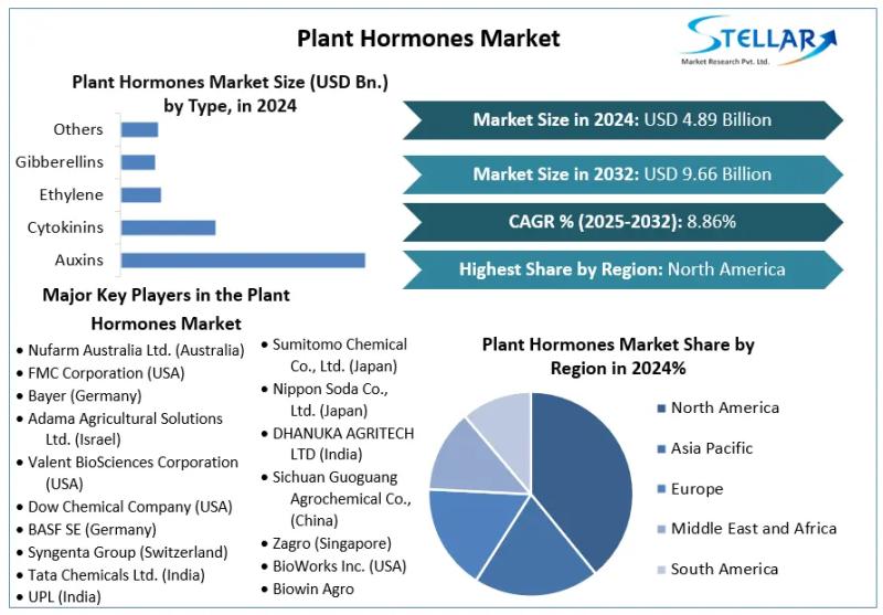 The Plant Hormones Market size was valued at USD 4.89 Bn. in 2024 and the total Plant Hormones Market size is expected to grow at a CAGR of 8.86% from 2025 to 2032, reaching nearly USD 9.66 Bn. by 2032.