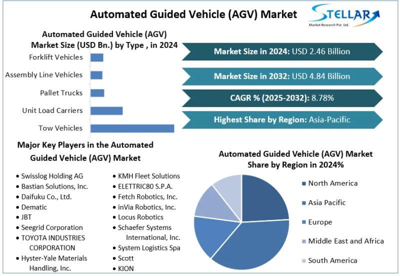 Automated Guided Vehicle (AGV) Market was valued nearly USD 2.46 Bn. in 2024 and is estimated to grow at a CAGR of 8.78% and is expected to reach at USD 4.84 Bn. by 2032.