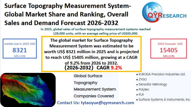 The global market for Surface Topography Measurement System was estimated to be worth US$ 8321 million in 2025 and is projected to reach US$ 15405 million, growing at a CAGR of 9.2% from 2026 to 2032.Global Leading Market Research Publisher QYResearch announces the release of its latest report "Surface Topography Measurement System - Global Market Share and Ranking, Overall Sales and Demand Forecast 2026-2032". Based on current situation and impact historical analysis (2021-2025) and forecast calculations (2026-2032), this report provides a comprehensive analysis of the global Surface Topography Measurement System market, including market size, share, demand, industry development status, and forecasts for the next few years.