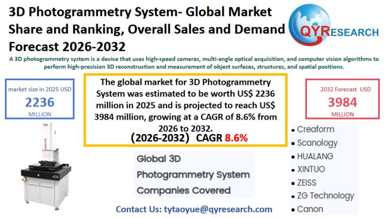 The global market for 3D Photogrammetry System was estimated to be worth US$ 2236 million in 2025 and is projected to reach US$ 3984 million, growing at a CAGR of 8.6% from 2026 to 2032.Global Leading Market Research Publisher QYResearch announces the release of its latest report "3D Photogrammetry System - Global Market Share and Ranking, Overall Sales and Demand Forecast 2026-2032". Based on current situation and impact historical analysis (2021-2025) and forecast calculations (2026-2032), this report provides a comprehensive analysis of the global 3D Photogrammetry System market, including market size, share, demand, industry development status, and forecasts for the next few years.