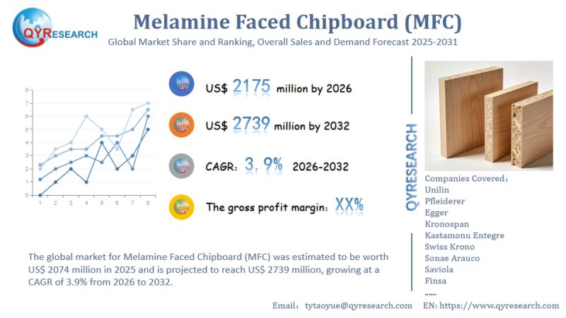 The global market for Melamine Faced Chipboard (MFC) was estimated to be worth US$ 2074 million in 2025 and is projected to reach US$ 2739 million, growing at a CAGR of 3.9% from 2026 to 2032.Global Leading Market Research Publisher QYResearch announces the release of its latest report "Melamine Faced Chipboard (MFC) - Global Market Share and Ranking, Overall Sales and Demand Forecast 2026-2032". Based on current situation and impact historical analysis (2021-2025) and forecast calculations (2026-2032), this report provides a comprehensive analysis of the global Melamine Faced Chipboard (MFC) market, including market size, share, demand, industry development status, and forecasts for the next few years.