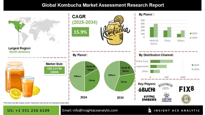 InsightAce Analytic Pvt. Ltd. announces the release of a market assessment report on the "Global Kombucha Market- by Flavor (Regular/Original, Herbs & Spices, Citrus, Berries, Apple, Coconut & Mangoes, Flowers, and Others), Distribution Channel (Food and Drink Specialty Store, Hypermarket/Supermarket, Convenience Store, and Online Retail), Trends, Industry Competition Analysis, Revenue and Forecast To 2034."