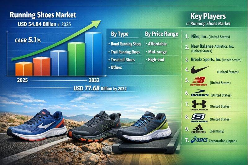 The global Running Shoes Market, valued at USD 54.84 billion in 2025, is set to experience substantial growth, with projections indicating a rise to USD 77.68 billion by 2032. This growth trajectory, which represents a compound annual growth rate (CAGR) of 5.1% from 2025 to 2032, is primarily driven by increasing awareness of fitness, technological advancements in shoe design, and the rising popularity of health-conscious lifestyles.