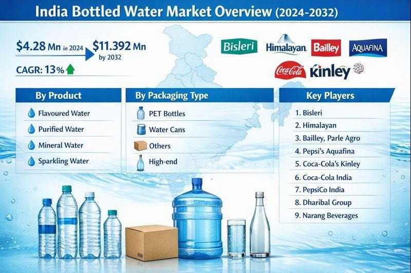 India's bottled water market has experienced significant growth, driven by rising health awareness, urbanization, and an increasing preference for safe, clean drinking water. As of 2024, the market size is valued at USD 4.28 million and is expected to reach USD 11.392 million by 2032, growing at a compound annual growth rate (CAGR) of 13%.