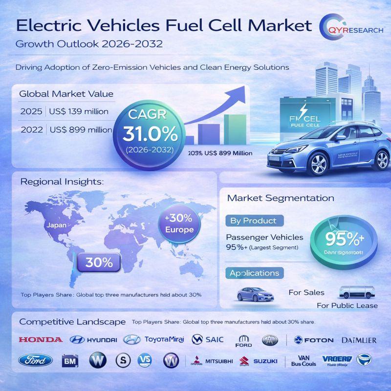 QY Research Inc., A global market research and consulting firm, has announced the release of its latest 2026 report titled "Electric Vehicles Fuel Cell - Global Market Share and Ranking, Overall Sales and Demand Forecast 2026-2032." The report provides a data-driven analysis of the global Electric Vehicles Fuel Cell market, integrating historical insights from 2020-2025 with forward-looking forecasts through 2032. It covers market size, competitive landscape, demand trends, and…