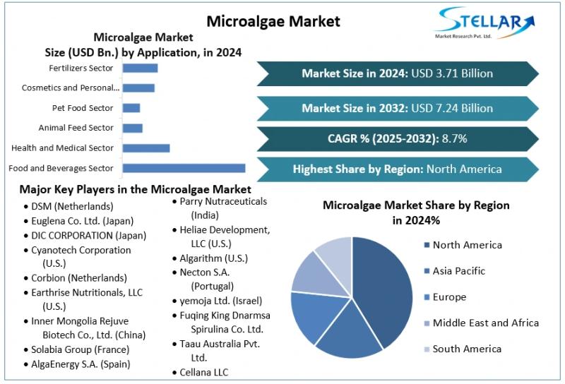 Microalgae Market size was valued at USD 3.71 Bn. in 2024 and the total Microalgae Market size is expected to grow at a CAGR of 8.7% from 2025 to 2032, reaching nearly USD 7.24 Bn. by 2032.