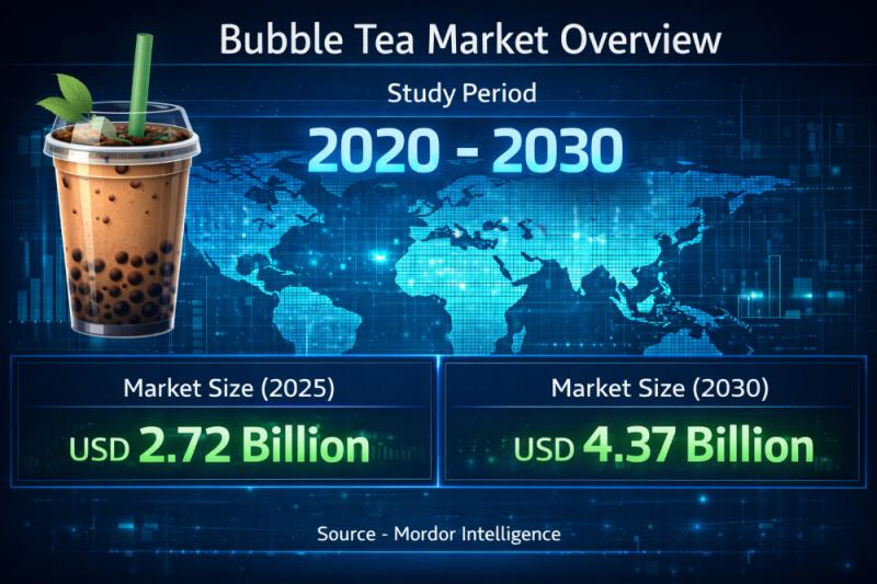 The bubble tea market size was valued at USD 2.72 billion in 2025 and is projected to reach USD 4.37 billion by 2030, supported by rising penetration beyond cafés into retail and digital channels.