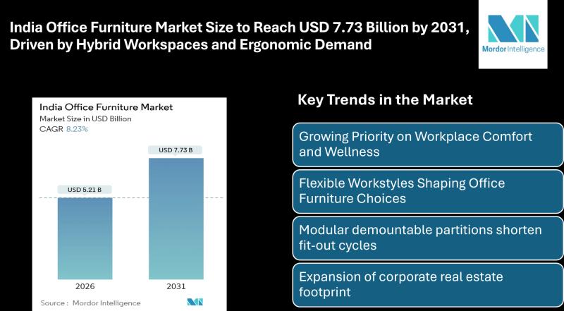 According to Mordor Intelligence, India office furniture market size is estimated at USD 5.21 billion in 2026, up from USD 4.81 billion in 2025, and is projected to reach USD 7.73 billion by 2031, registering a CAGR of…