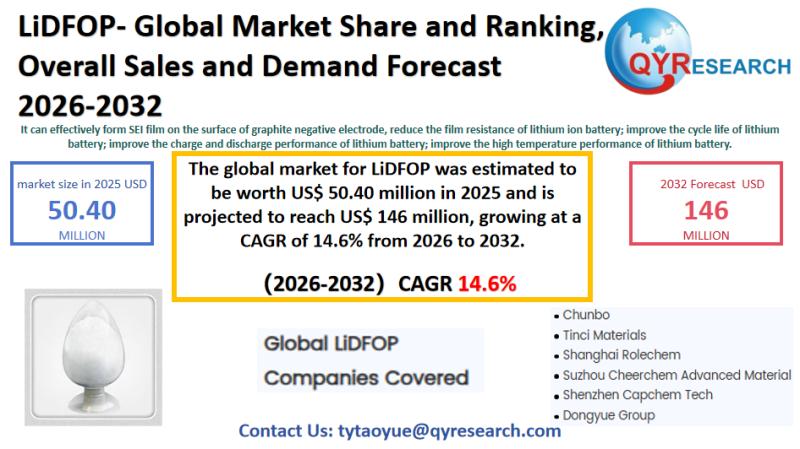 The global market for LiDFOP was estimated to be worth US$ 50.40 million in 2025 and is projected to reach US$ 146 million, growing at a CAGR of 14.6% from 2026 to 2032.