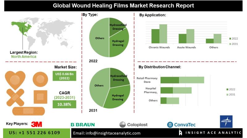 InsightAce Analytic Pvt. Ltd. announces the release of a market assessment report on the "Global Wound Healing Films Market - (By Product (Hydrocolloid dressing, Hydrogel dressing, Alginate dressing, Collagen dressing, Foam dressing, Others), By Application (Chronic wound, Acute Wounds), By End Users (Hospitals, Clinics, ASCs, Home Healthcare, Others), By Distributional Channel (Hospital Pharmacy, Retail Pharmacy store, Online platform)), Trends, Industry Competition Analysis, Revenue and Forecast To 2031."