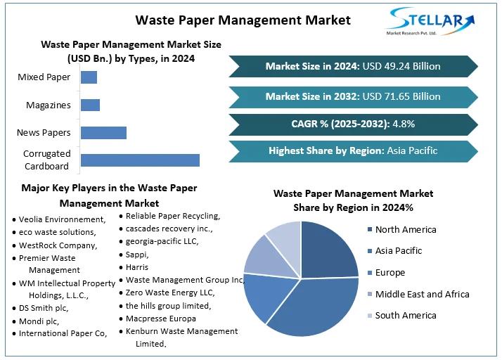 Waste Paper Management Market size was valued at USD 49.24 Bn. in 2024 and the total Waste Paper Management revenue is expected to grow by 4.80% from 2025 to 2032, reaching nearly USD 71.65 Bn.
