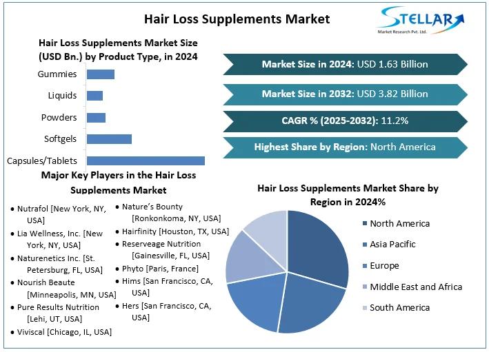 Hair Loss Supplements Market size was valued at USD 1.63 Bn. in 2024. The total Hair Loss Supplements Market revenue is expected to grow by 11.2% from 2025 to 2032, reaching nearly USD 3.82 Bn.The hair loss supplements market has emerged as a rapidly growing segment within the global nutraceutical and personal care industry. Hair loss is a common concern affecting both men and women across different age groups due to factors such as stress hormonal imbalance nutritional deficiencies aging genetics and environmental exposure. Hair loss supplements are formulated with vitamins minerals amino acids botanical extracts and bioactive compounds designed to support hair growth strengthen hair follicles and reduce hair thinning.