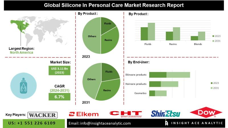 InsightAce Analytic Pvt. Ltd. announces the release of a market assessment report on the "Global Silicone in Personal Care Market- (By Product (Fluids, Resins, Blends, Cross polymers), By Application (Skincare Products, Haircare Products, Cosmetics, Antiperspirants & Deodorants)), By Region, Trends, Industry Competition Analysis, Revenue and Forecast To 2031." According to the latest research by InsightAce Analytic, the Global Silicone in Personal Care Market is valued at US$ 3.11 Bn in 2023,