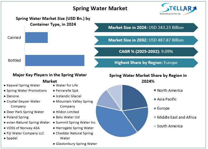 Spring Water Market size was valued at USD 243.23 Bn. in 2024 and the total Spring Water Market size is expected to grow at a CAGR of 9.09 % from 2025 to 2032, reaching nearly USD 487.87 Bn. by 2032.