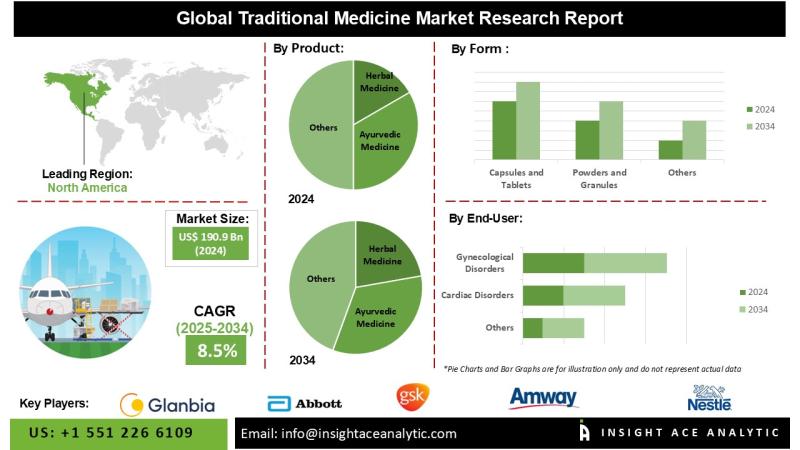 InsightAce Analytic Pvt. Ltd. announces the release of a market assessment report on the "Global Traditional Medicine Market - (By Product (Herbal Medicine, Ayurvedic Medicine, Unani Medicine, Alternative Medicine, Homeopathy Medicine, Others ), By Form (Capsules and Tablets, Powders and Granules, Liquid Extracts, Syrups, Creams and Ointment, Others ), By Disease Indication (Cardiac Disorders, Bone and Joint Disorders, Gynecological Disorders, Neurological and Mental Disorders, Digestive Disorders, Others), By Distribution Channel…