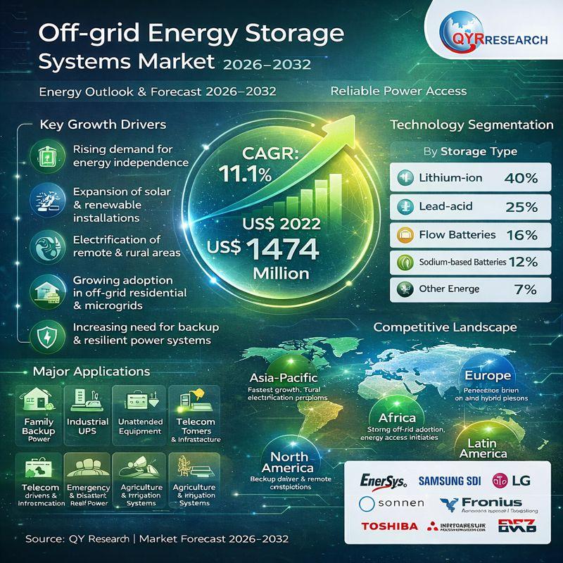 QY Research Inc., A global market research and consulting firm, has announced the release of its latest 2026 report titled "Off-grid Energy Storage Systems - Global Market Share and Ranking, Overall Sales and Demand Forecast 2026-2032." The report provides a data-driven analysis of the global Off-grid Energy Storage Systems market, integrating historical insights from 2020-2025 with forward-looking forecasts through 2032. It covers market size, competitive landscape, demand trends,…