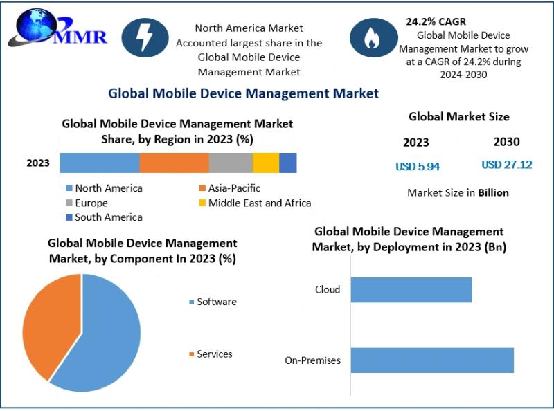 The Mobile Device Management (MDM) Market was valued at USD 5.94 billion in 2023 and is expected to expand at an impressive CAGR of 24.2% from 2024 to 2030, reaching approximately USD 27.12 billion by 2030, according to the latest industry analysis.This rapid growth is fueled by the proliferation of mobile devices in enterprises, rising cybersecurity threats, increasing remote workforce adoption, and the accelerating shift toward cloud-based IT infrastructure.